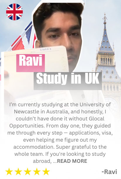 With Glocal Opportunities, you don’t have to stress over deadlines or endless paperwork. As one of the best study abroad consultants in India, we guide you through every step - from choosing the right universities and preparing SOPs, to handling applications and filing your visa. You save a lot of time, avoid common mistakes, and improve your chances of securing admission and even scholarships.